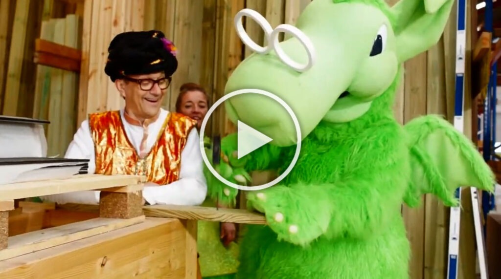 Og spytter savsmuld ud til højre, venstre, for og bag